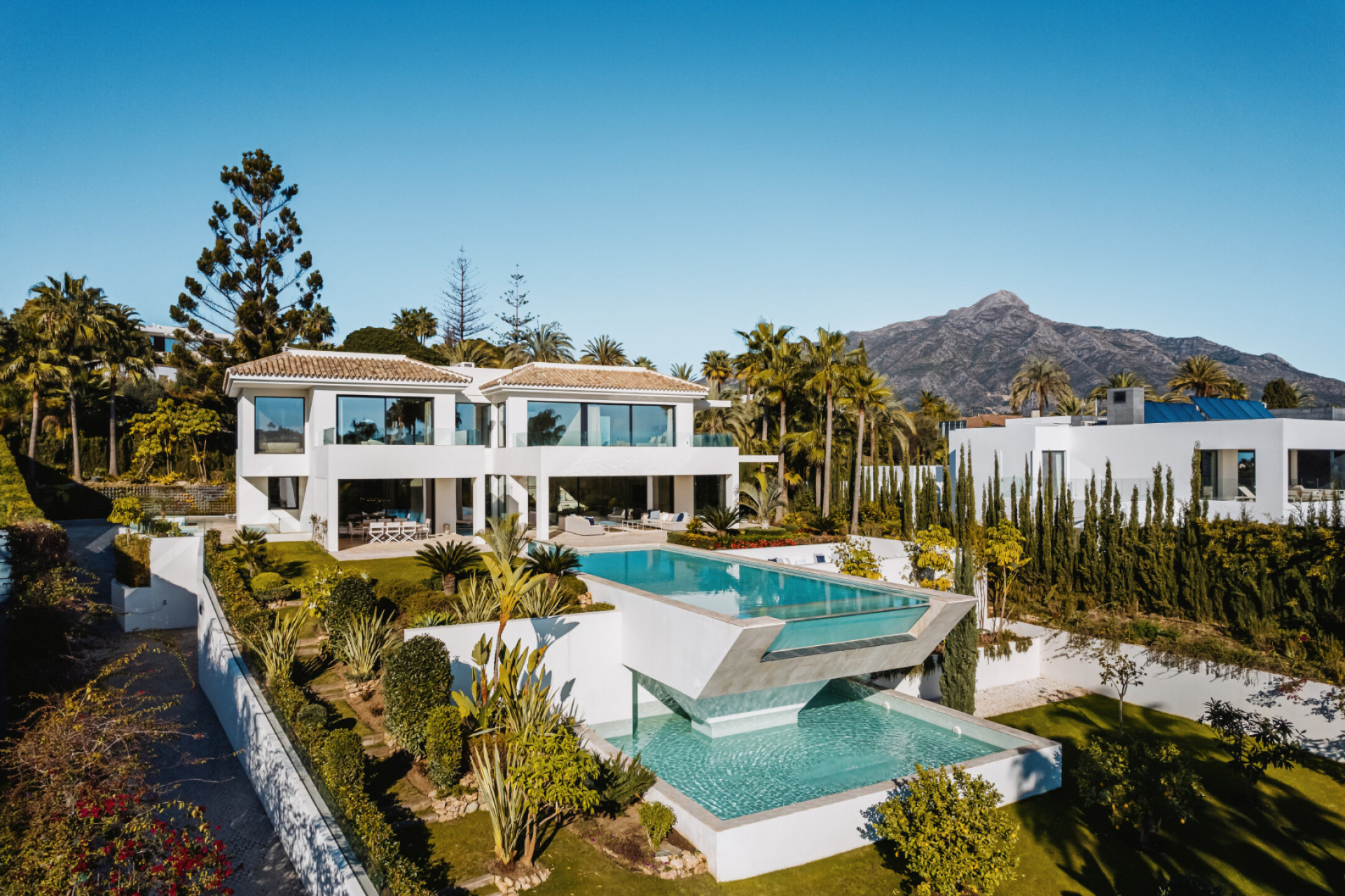 This striking contemporary villa, set within a secure private community in Nueva Andalucía, is designed for effortless relaxation and elegant entertaining. The residence is embraced by a beautifully landscaped garden featuring sculpted greenery, mature trees, and a welcoming pergola that forms a shaded outdoor lounge. A pristine private pool framed by smooth stone tiles serves ... Read more