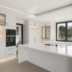 The main living floor is designed with an open-concept layout that promotes connection and flow. Expansive living and dining areas are anchored by a designer kitchen featuring a striking natural stone island. A separate service kitchen allows for seamless entertaining while preserving the clean aesthetic of the main space. Floor-to-ceiling windows flood the area with natural light and open onto an inviting outdoor terrace with a saltwater infinity pool, surrounded by mature tropical landscaping that enhances privacy and tranquility. This level also includes a stylish en-suite guest bedroom, along with ceiling-integrated speakers and a pre-installed smart home system for effortless modern living.
