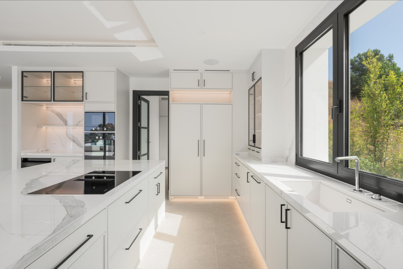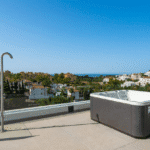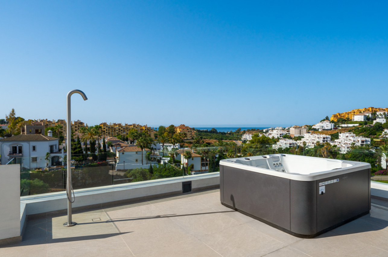 A private driveway leads directly to the rooftop terrace, creating an impressive and elevated arrival experience. From this vantage point, panoramic views stretch across the manicured fairways of La Resina Golf Course and out to the glittering Mediterranean Sea. Complete with a Jacuzzi and a built-in BBQ area (pre-installed), this space is ideal for entertaining or simply unwinding under the sunset sky.