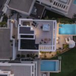 The rooftop invites relaxation and wellness with an outdoor gym and jacuzzi, while the ground level is dedicated to leisure and guest accommodation. A stylish multimedia room is accompanied by two additional bedrooms, a bathroom, storage space, and natural light filtering through an interior patio.