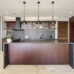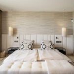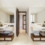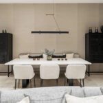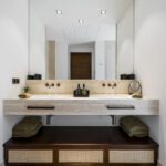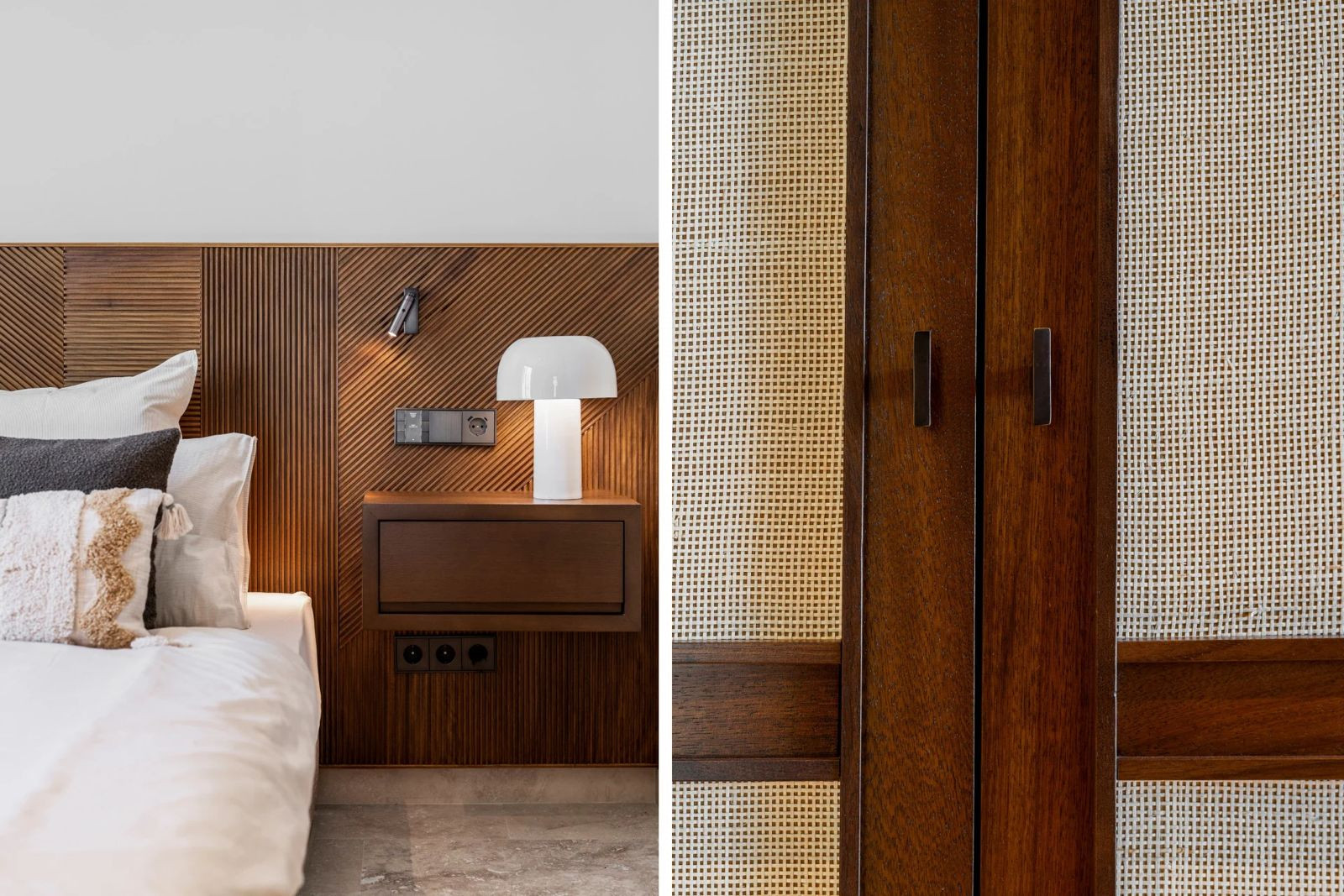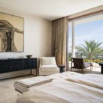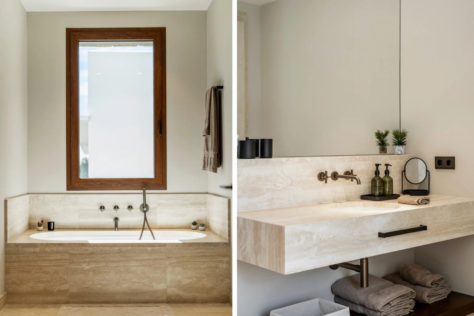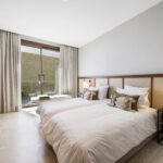 The apartment boasts three spacious en-suite bedrooms, each with bathrooms finished in elegant sand-hued Carrara marble, complete with double vanities and walk-in showers. The master suite offers a custom walk-in wardrobe, a luxurious bathtub, and an oversized window that opens onto the terrace, flooding the space with natural light. High-end finishes and warm wooden accents throughout create an inviting, harmonious atmosphere that complements the natural surroundings.
