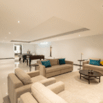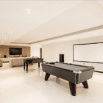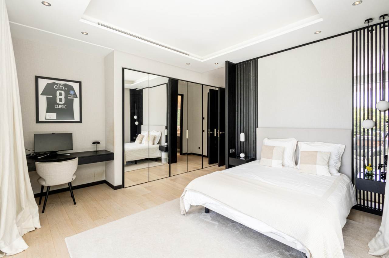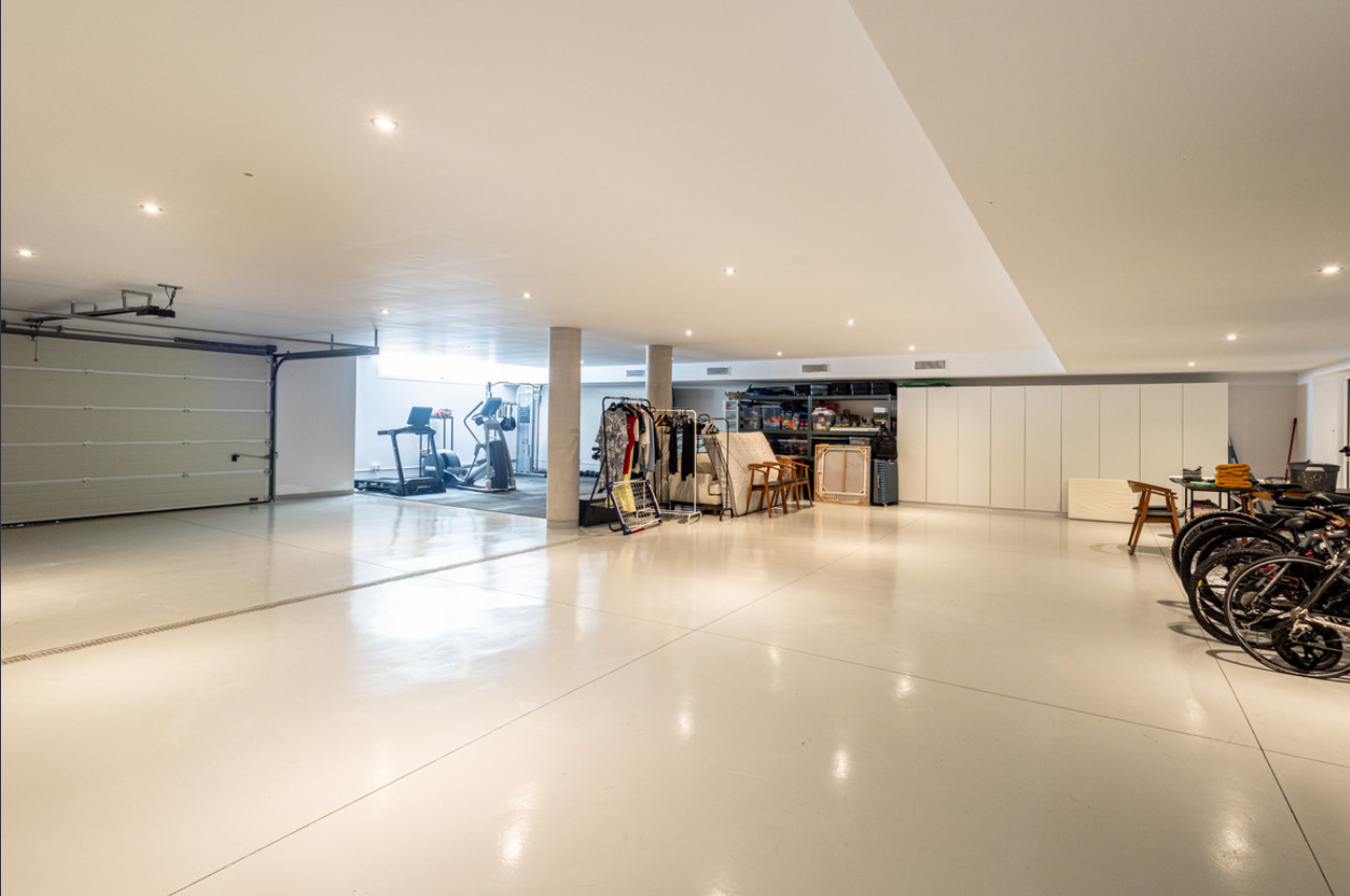 On the lower level, the villa features a spacious basement with parking for multiple vehicles, a gym, a laundry and utility room, as well as a bedroom with bathroom currently used as an office. A large leisure room with its own bathroom offers the flexibility to be converted into a seventh bedroom if desired.