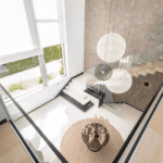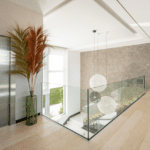 The upper floor is dedicated to the master suite, complete with a glass-enclosed dressing room and an exceptionally large bathroom. Two additional bedrooms, each with en-suite bathrooms, are connected by a bright gallery overlooking the living area below, enhancing the sense of openness and flow throughout the villa.