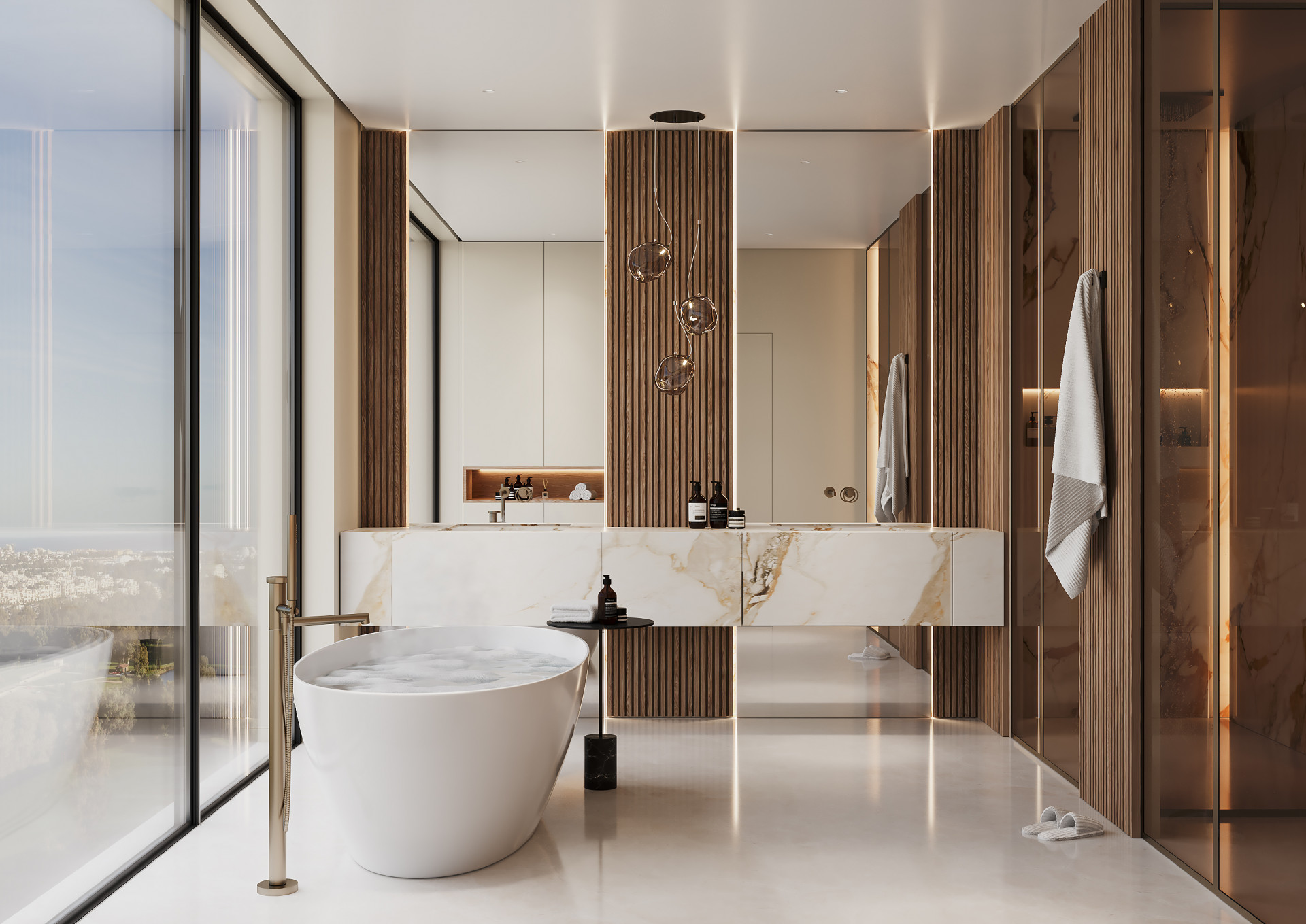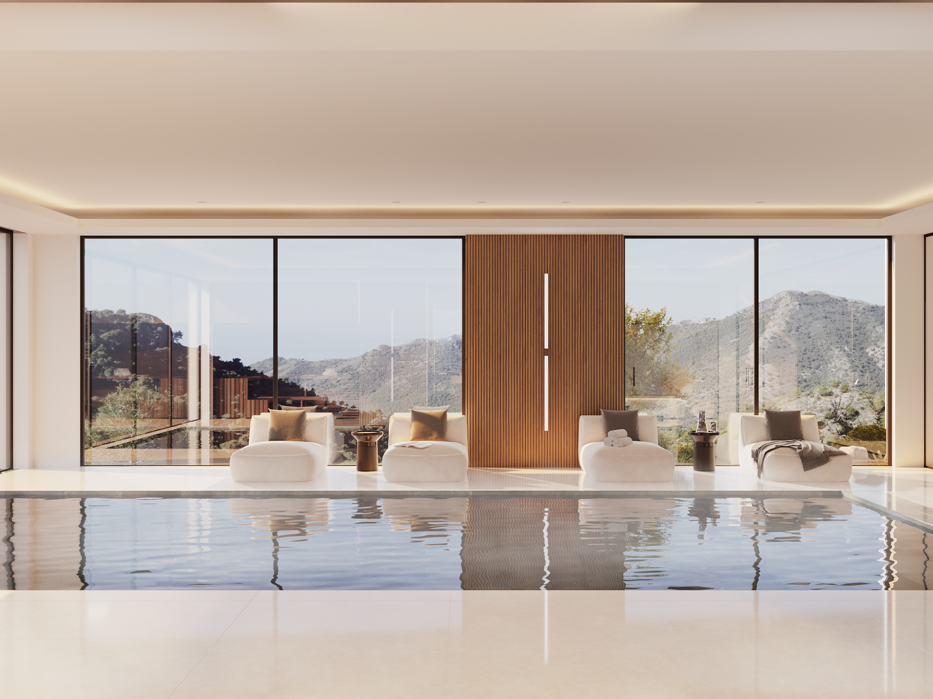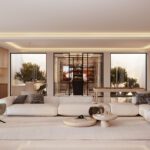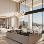 With 1,250 m² of elegant interiors spread across three levels and 663 m² of sun-drenched terraces, this south-facing home captures breathtaking panoramic views of the Mediterranean Sea, golf course, and serene mountains.
