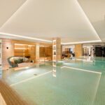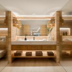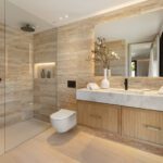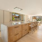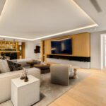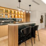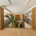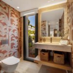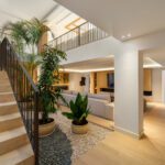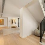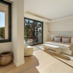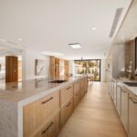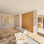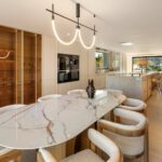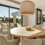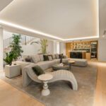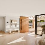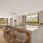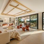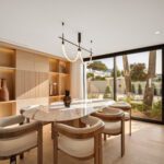 Inside, the interiors exude understated luxury, with a palette of soft neutral tones and organic textures. Wooden features, including elegant ribbed partitions, lend warmth and sophistication throughout the open-plan living and dining areas. The home offers five beautifully appointed bedrooms, ideal for family life or hosting in style.