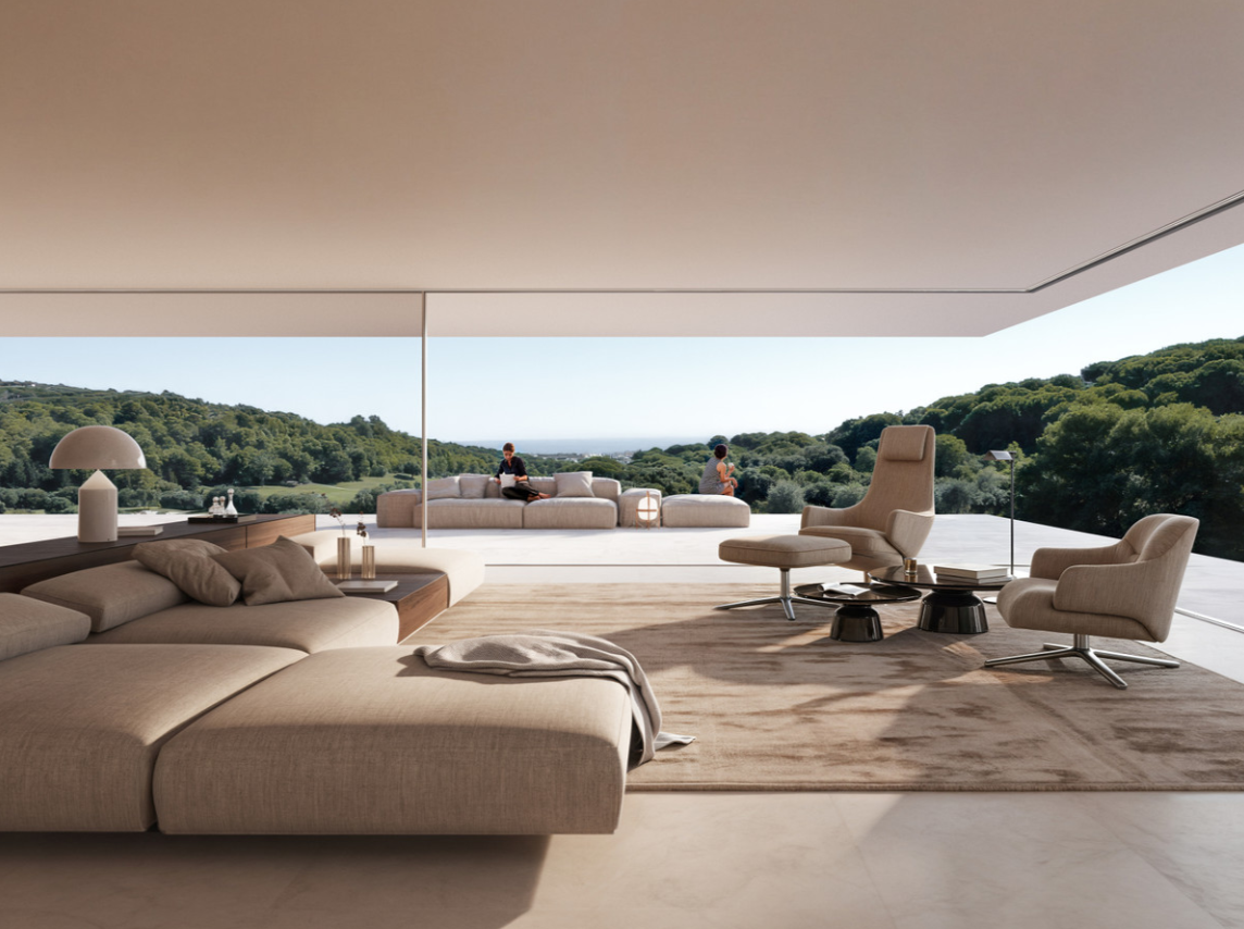 Floor-to-ceiling windows and expansive outdoor living spaces frame sweeping views at every turn—whether across the verdant golf course or out toward the shimmering Mediterranean horizon.