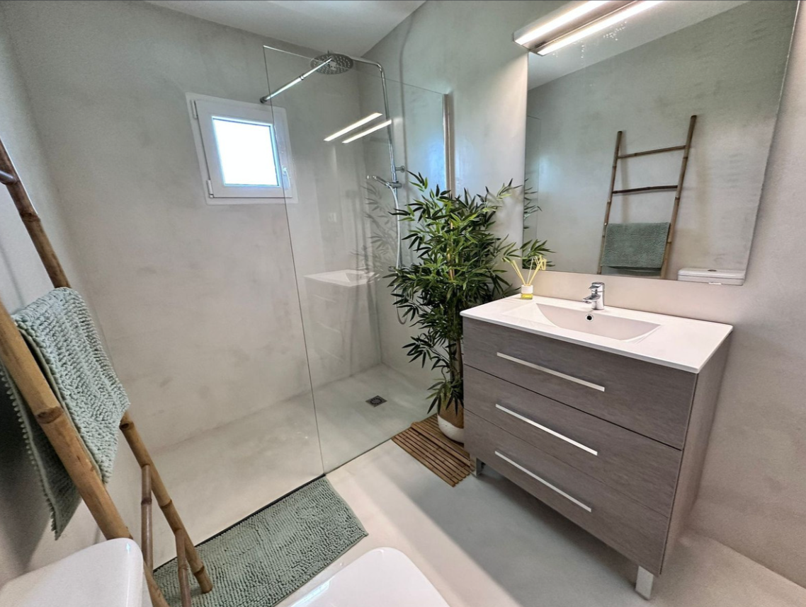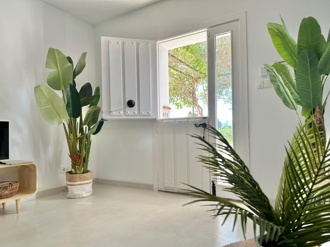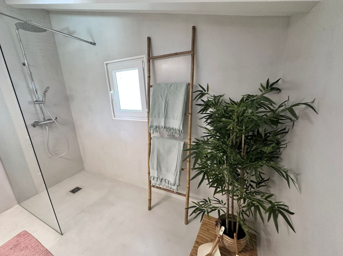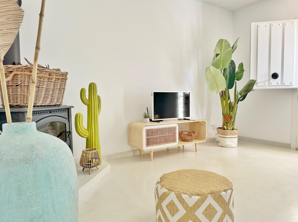 Inside, the ground floor features a cozy living room with a welcoming fireplace, a fully fitted kitchen with sleek microcement countertops, two comfortable bedrooms, and a full bathroom. Upstairs, a spacious double bedroom with an ensuite bathroom opens onto a large terrace, perfect for soaking in the spectacular views that surround the home. Elegant microcement floors flow throughout the house and bathrooms, uniting modern comfort with rustic character.