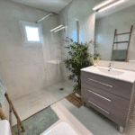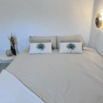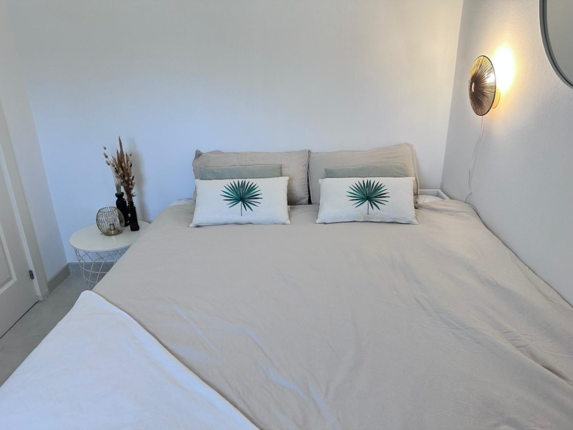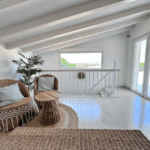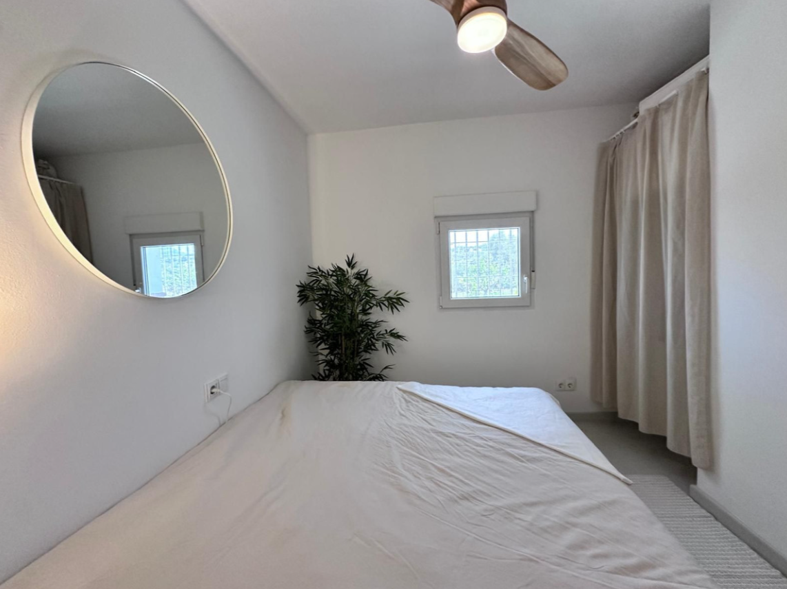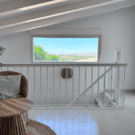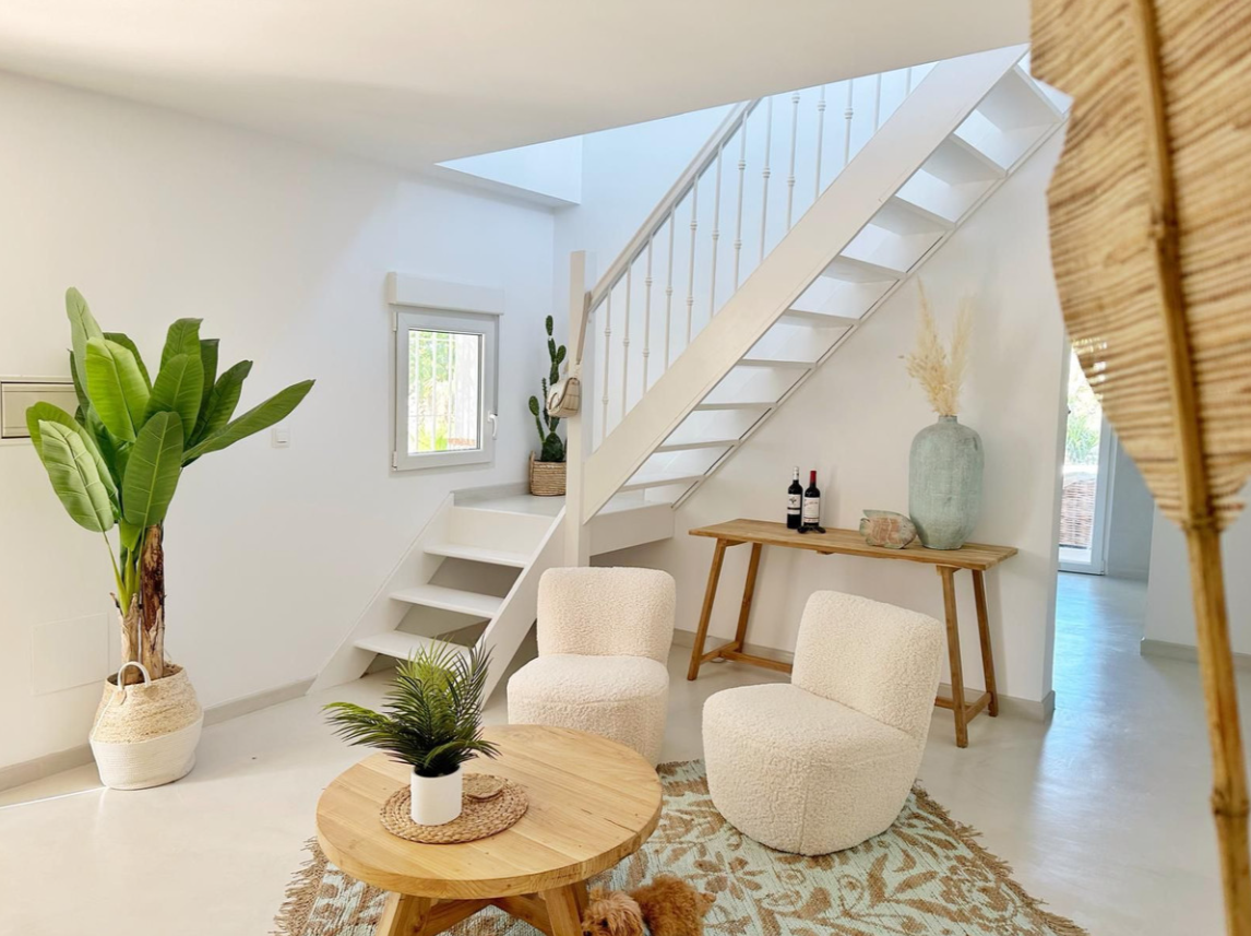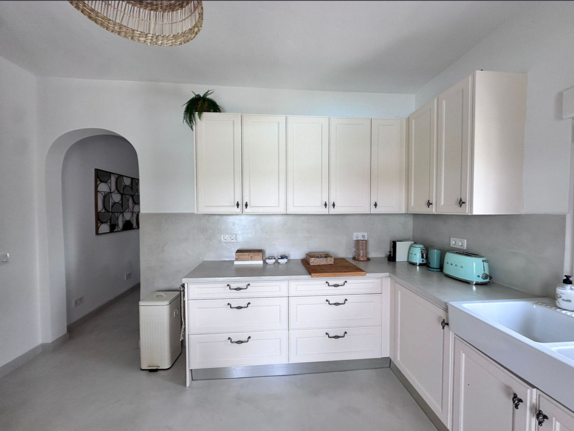 Inside, the ground floor features a cozy living room with a welcoming fireplace, a fully fitted kitchen with sleek microcement countertops, two comfortable bedrooms, and a full bathroom. Upstairs, a spacious double bedroom with an ensuite bathroom opens onto a large terrace, perfect for soaking in the spectacular views that surround the home. Elegant microcement floors flow throughout the house and bathrooms, uniting modern comfort with rustic character.