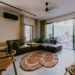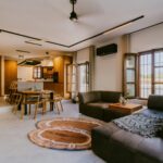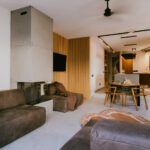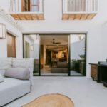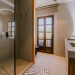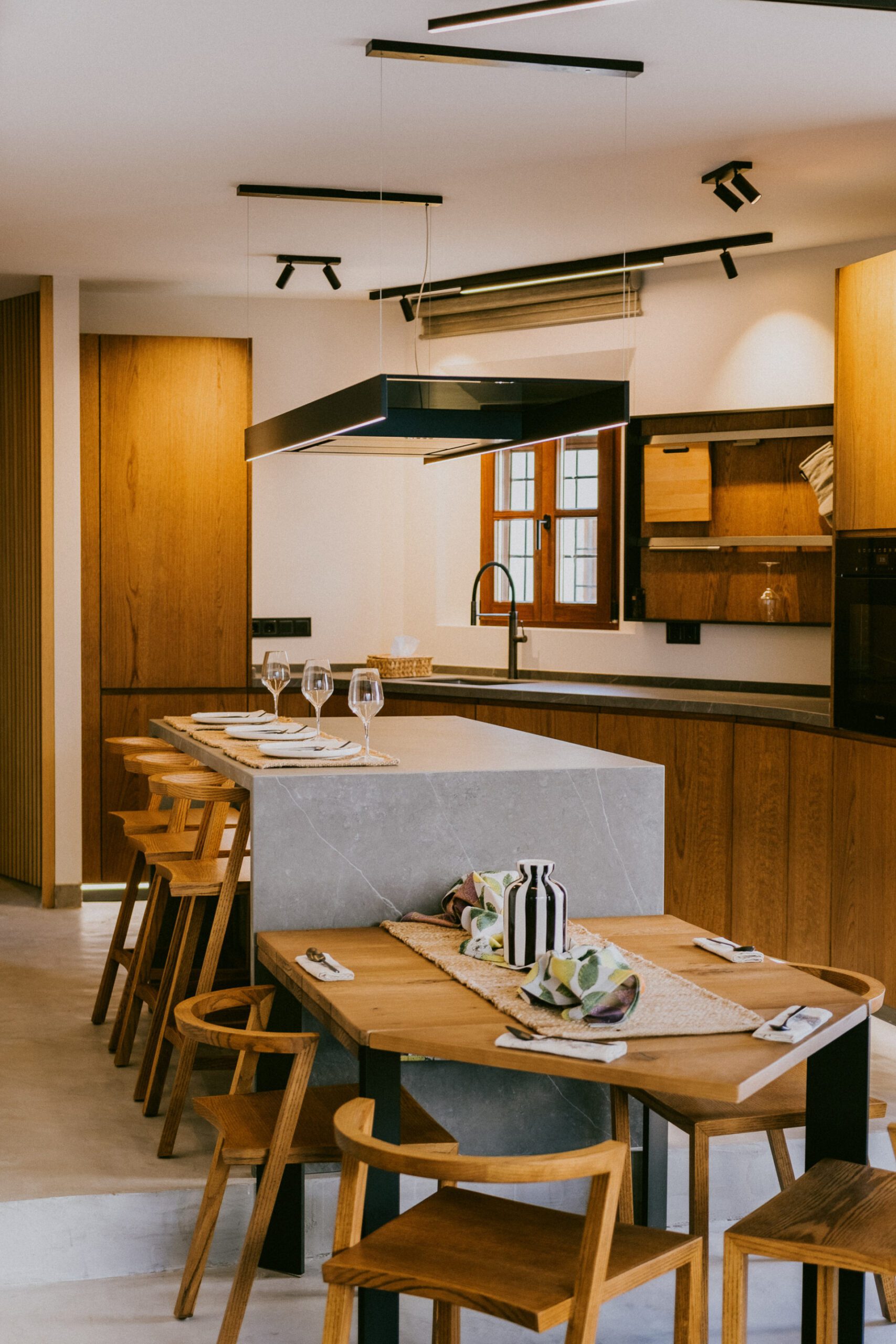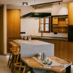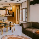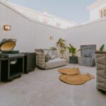 The open-concept living and dining area is flooded with natural light, creating an inviting atmosphere for both relaxation and entertaining. A real wood-burning fireplace adds warmth and character, while expansive glass doors open onto a private Andalusian-inspired patio—ideal for enjoying peaceful outdoor moments.