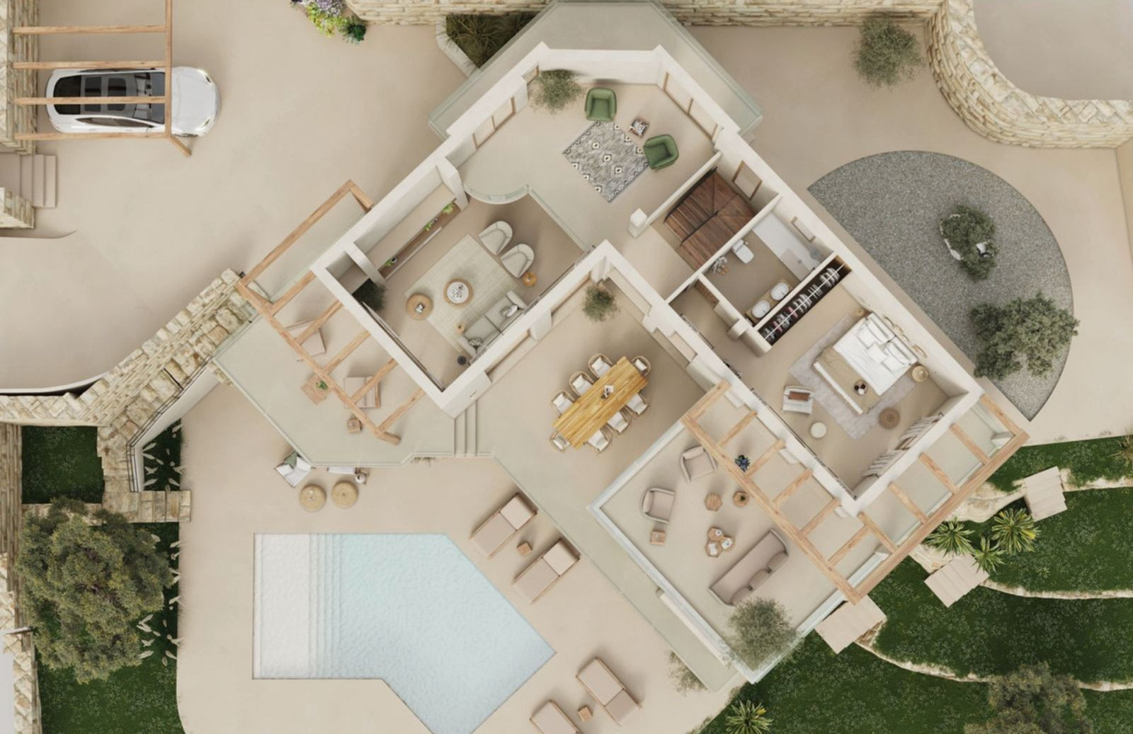 Outside, the private infinity pool appears to merge with the sea, offering uninterrupted views that change from soft dawn hues to golden sunsets. Multiple terraces with varied orientations provide the perfect settings for alfresco dining, sunbathing, or simply enjoying the quiet rhythm of coastal life. A private solarium crowns the home, inviting moments of reflection under the stars.