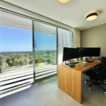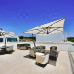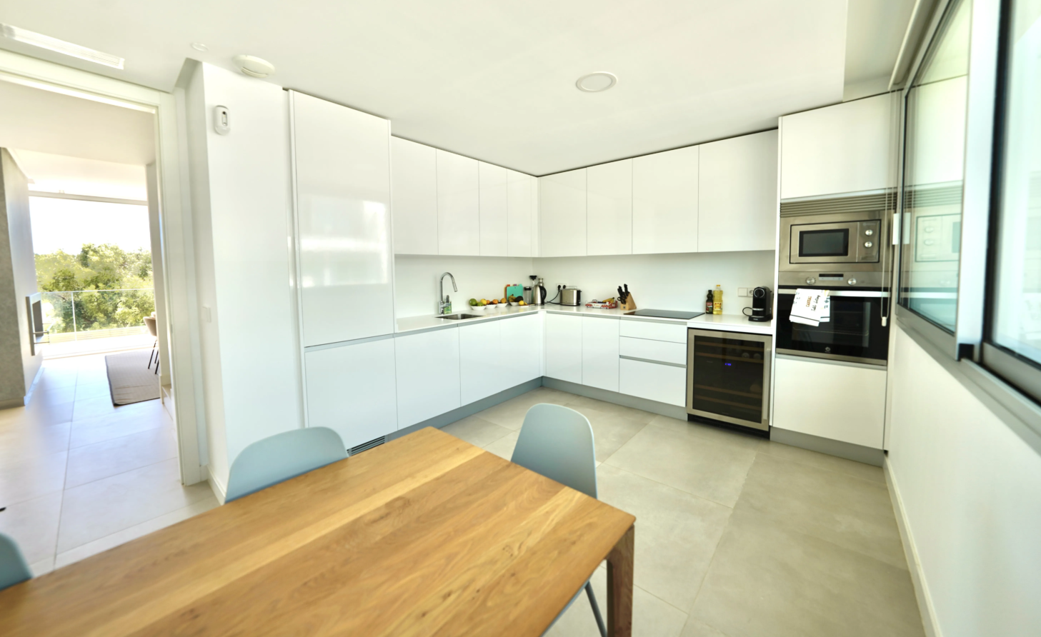 On the upper floor, a bright and airy bedroom—currently used as an office—offers its own separate bathroom and leads out to a large rooftop terrace. This expansive outdoor space is ideal for al fresco dining, lounging, or even adding a private spa, all while enjoying sweeping views of the golf course and sea.