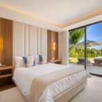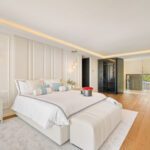 The home comprises six uniquely styled bedrooms. The luxurious master suite spans the entire first floor, complete with generous walk-in wardrobes, an exquisite marble bathroom with a sculpted bathtub, a private office, and a large terrace with sweeping sea views.