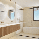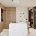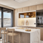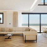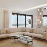 The open-plan interior boasts modern elegance and seamless functionality, with double-height ceilings creating a bright and airy atmosphere. Floor-to-ceiling windows bring in natural light and frame beautiful coastal views. The high-end kitchen and bathrooms are equipped with premium materials from renowned global brands such as Saloni, Roca, Cosentino, Vescom, Dekton, and Grohe, ensuring timeless quality.
