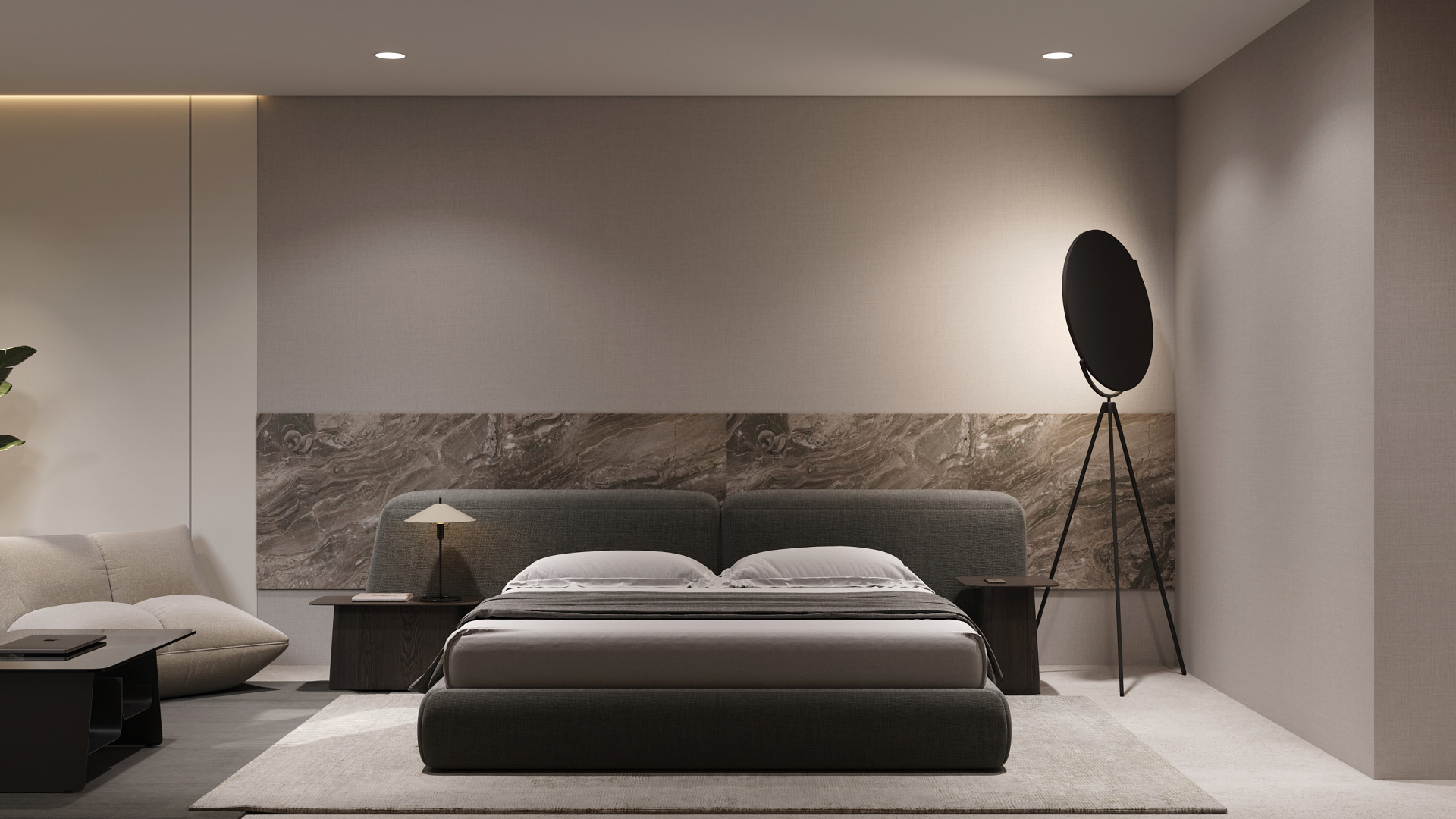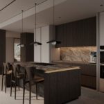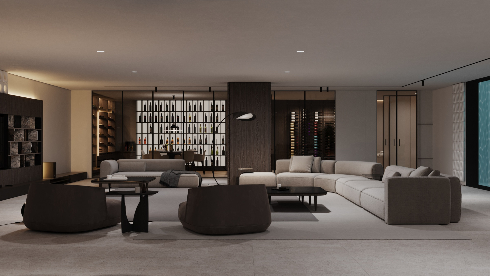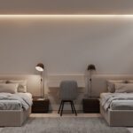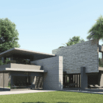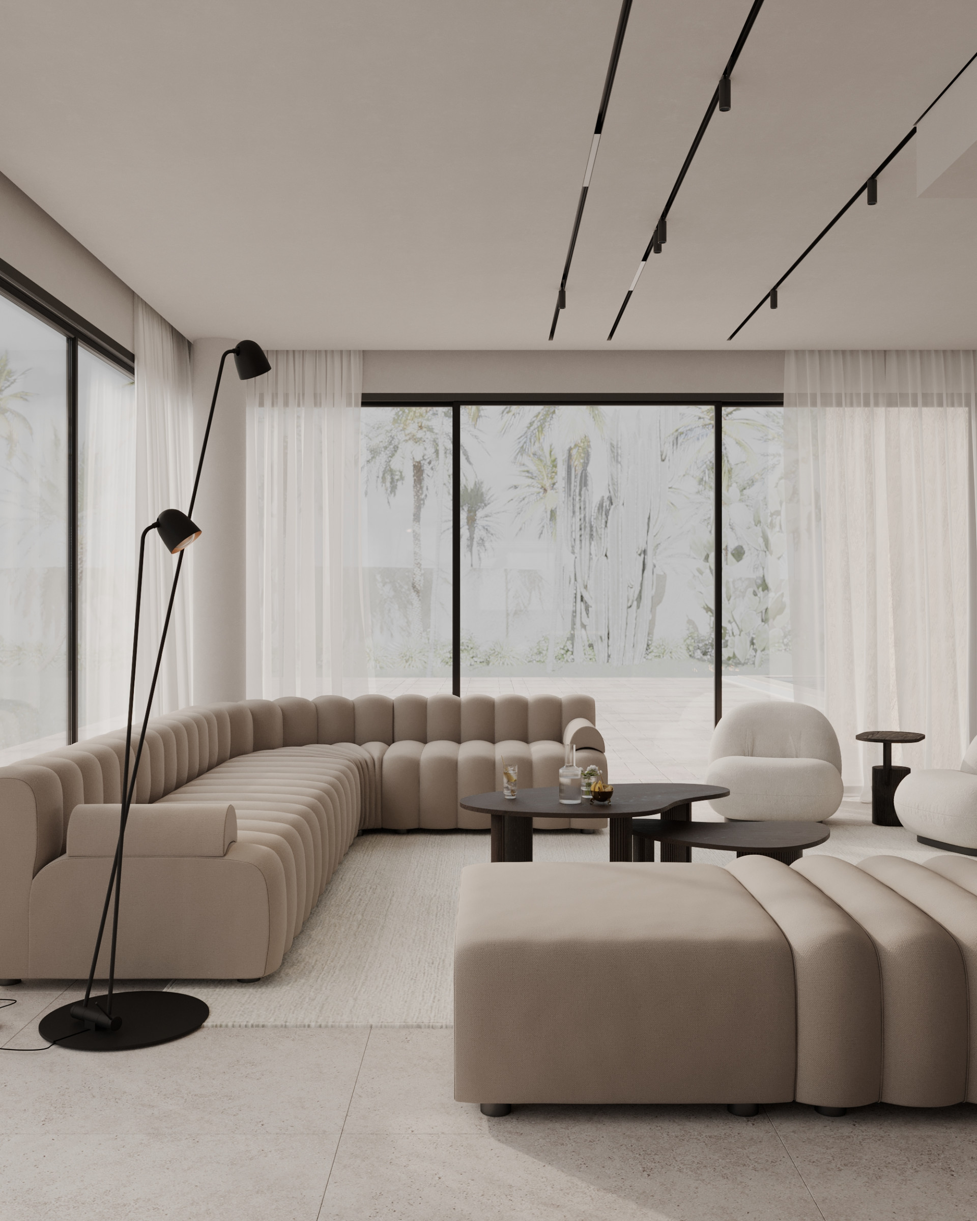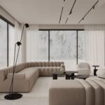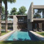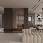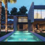Inside, the villa features eight en-suite bedrooms, each with built-in wardrobes. The master suite includes a private terrace and a luxurious walk-in closet. The interiors are thoughtfully designed with a neutral palette, natural materials, and floor-to-ceiling windows that flood the home with natural light and enhance its sense of space.