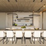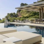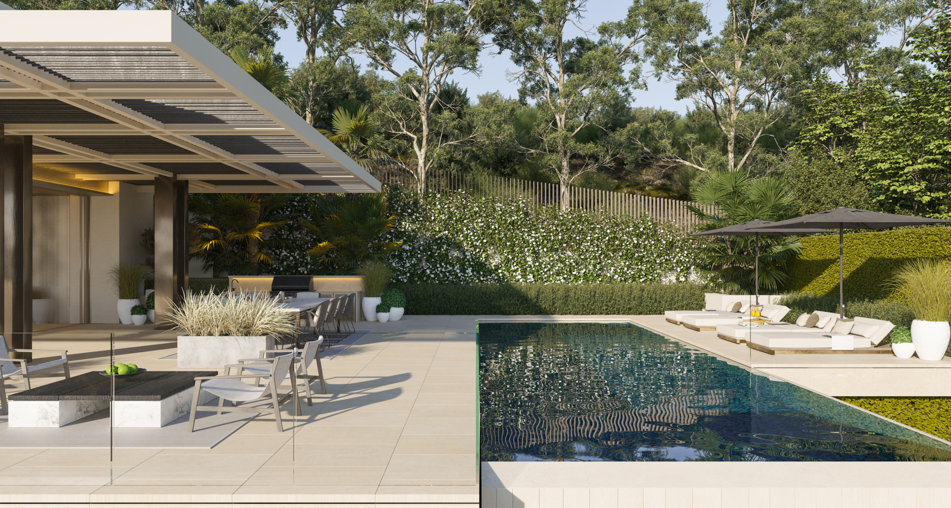 The main living floor is the epitome of modern Mediterranean living. An expansive open-plan kitchen, dining, and lounge area extends onto a large terrace, ideal for entertaining. Whether you're hosting under the stars or enjoying a quiet family evening, the space is complete with multiple lounging areas, a BBQ, an al fresco dining table, and a striking 47-square-metre pool that becomes the centrepiece of outdoor life. This level also includes a guest suite with ensuite, a guest WC, a secondary prep kitchen, and a utility room to ensure effortless day-to-day living.