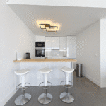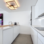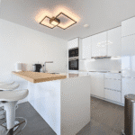 Die elegante, voll ausgestattete Küche verbindet sich harmonisch mit dem Wohnbereich und ist mit einem Silestone Arbeitstisch und hochwertigen Materialien ausgestattet.