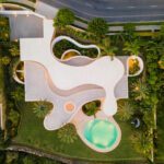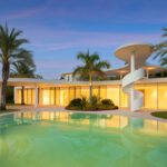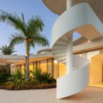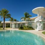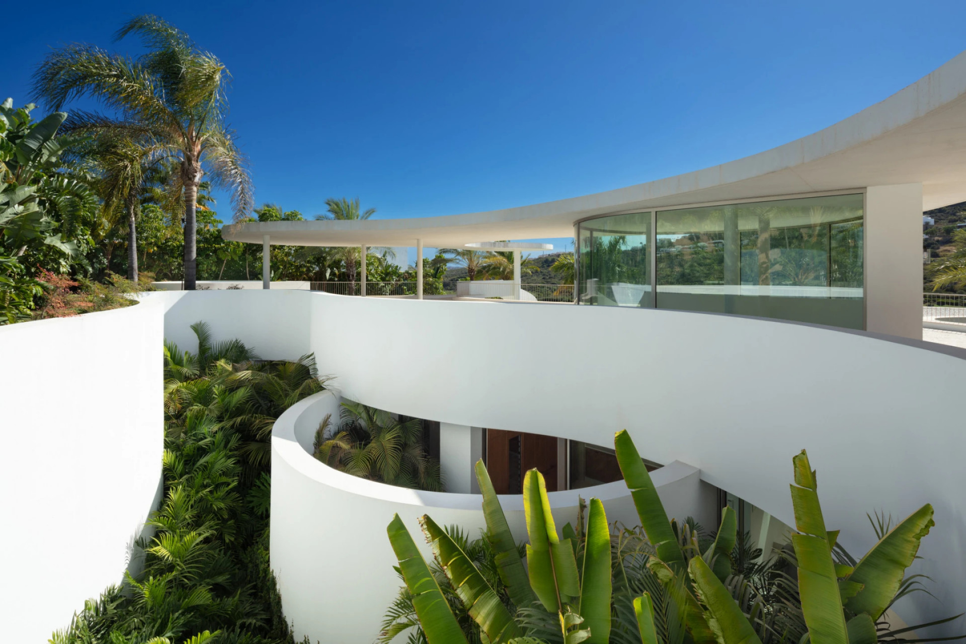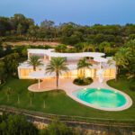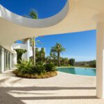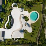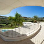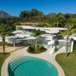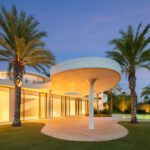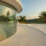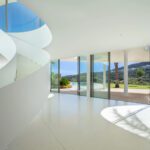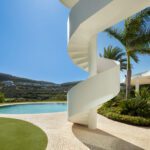 This distinguished villa exemplifies architectural brilliance, blending uniqueness with elegance. Designed by the renowned Vicens & Ramos architects, its futuristic yet nostalgic design captures attention with its flowing lines and seamless connection to the lush landscape. The villa integrates effortlessly with nature, surrounded by a vibrant green environment. The ground floor is dedicated to the living spaces, while the upper level is crowned with a striking dome-like entrance and a custom spiral staircase that exudes sophistication.