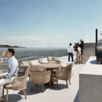 The spacious living area, with its towering ceilings, is flooded with natural light, enhancing the sense of openness and highlighting the spectacular views of the sea. The central kitchen and living room are designed with sophistication and functionality, incorporating premium finishes throughout.