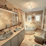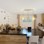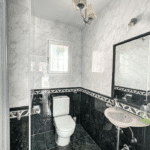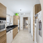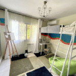The fully fitted kitchen is both functional and inviting, opening onto a delightful rear patio that’s ideal for al fresco dining. A practical laundry room is conveniently located nearby. On the mid-level, you’ll find a comfortable double bedroom with fitted wardrobes and stunning views over the pool, along with a full bathroom.