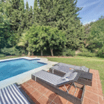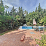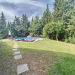 Outside, the property boasts a large private swimming pool surrounded by beautifully landscaped gardens filled with mature fruit and cypress trees, creating a serene and completely private oasis. The low-maintenance garden design allows for easy upkeep while preserving its natural beauty.