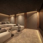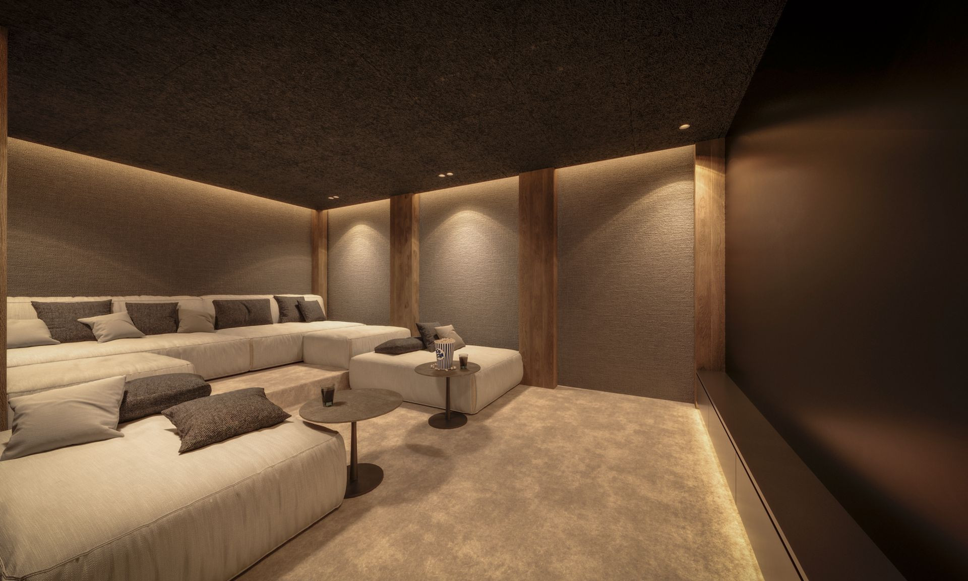 The basement level is dedicated to social spaces ideal for both entertaining and relaxing. A formal living room, sleek kitchen, and dining area open to a grand terrace, where an infinity pool flows seamlessly into the horizon. A hidden preparation kitchen and pantry provide privacy without sacrificing convenience. This level also includes a luxurious cinema room, a fully equipped gym, and two generously sized bedrooms, enhancing the home's appeal as a venue for leisure and hospitality.