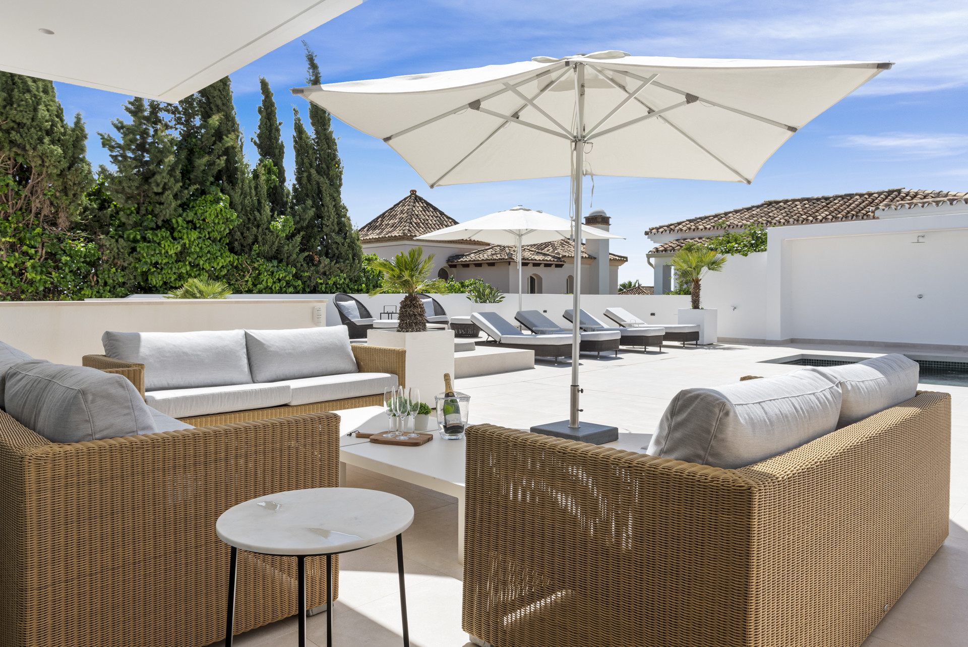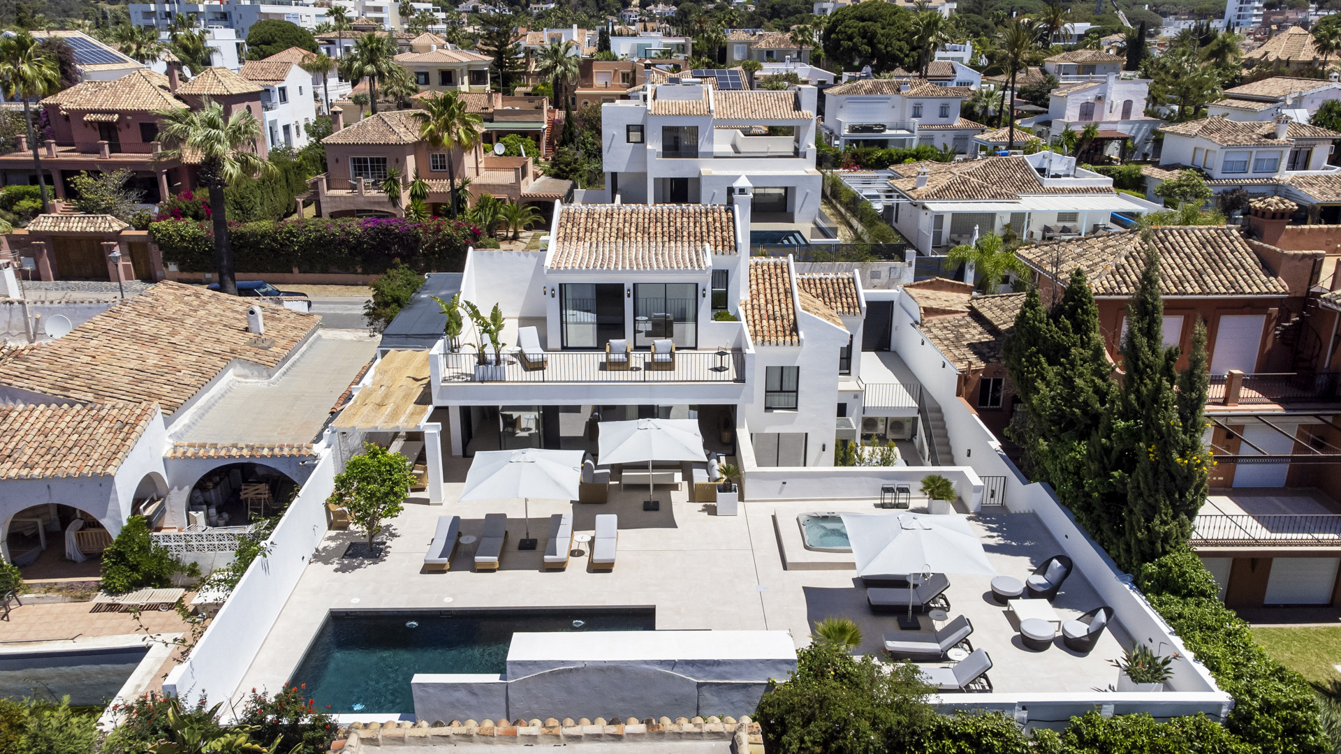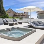 Outdoors, the heated pool has been extended for year-round use, accompanied by a rejuvenating jacuzzi, rainfall shower, and a fully equipped BBQ dining area—creating an idyllic retreat for entertaining or relaxing under the Spanish sun.