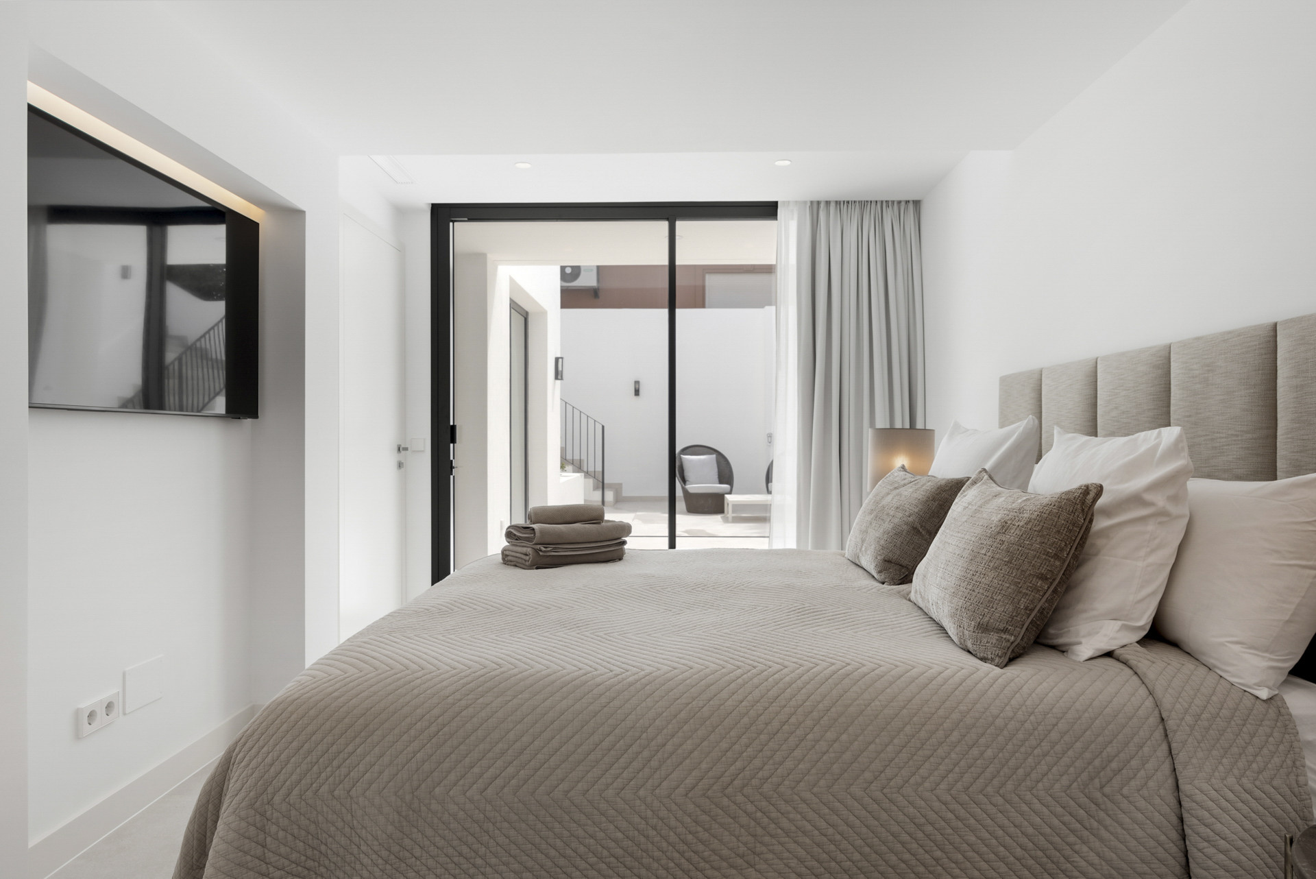 The master suite crowns the home, offering breathtaking views of the Mediterranean Sea. Complete with a private balcony, sun loungers, and a cozy coffee nook, it’s a luxurious space designed for tranquil mornings and romantic evenings.