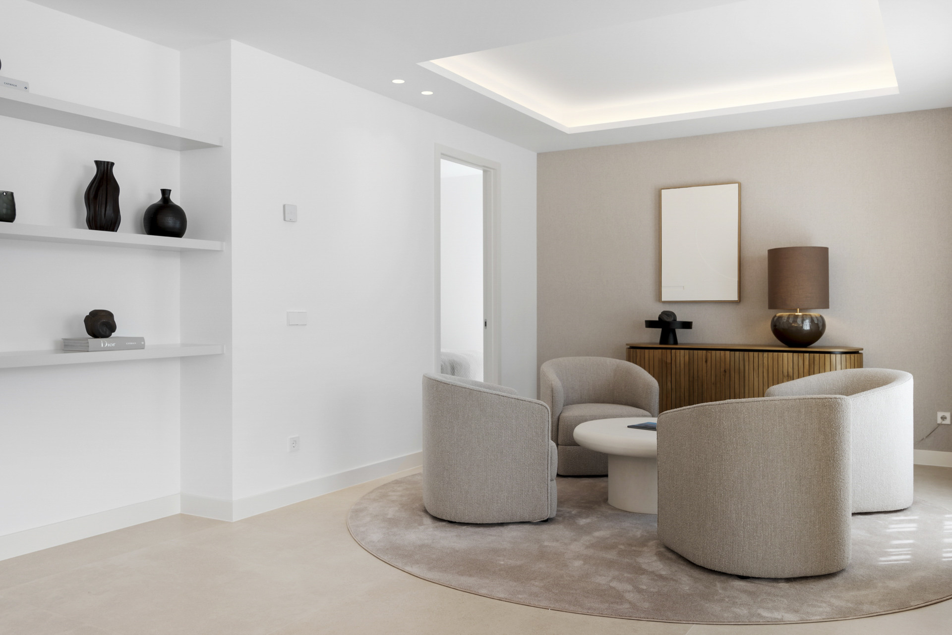 The lower level hosts two more en-suite bedrooms with direct terrace access, along with a snug TV room for laid-back entertainment. Practical features such as a laundry room and a mini wine cellar add to the home’s comfort and convenience.