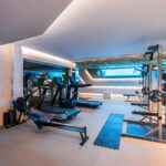 The villa’s outdoor spaces are crowned by an impressive infinity pool with cascading water features and a James Bond-style gym in the basement with underwater views into the pool—offering a truly cinematic experience.
