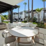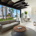 This modern apartment offers stunning sea views and is situated in the prestigious Puente Romano Resort on the Marbella Golden Mile. It epitomizes coastal elegance, perfectly blending with its resort surroundings to reflect a luxurious Mediterranean lifestyle. The apartment features a spacious, covered terrace ideal for alfresco dining and relaxation, with direct views of the lush community garden and the sea. The terrace is easily accessible from the living area and master bedroom through floor-to-ceiling glass sliding doors.