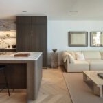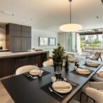 The interior is designed with a contemporary and stylish open-plan layout that combines the kitchen, dining, and living areas into a harmonious space. Neutral tones and natural wood accents throughout the floors and kitchen cabinetry enhance the ambiance. Modern furniture and finishes add both practicality and elegance, creating a comfortable and visually appealing environment. The kitchen is fully equipped, featuring a striking marble island and countertops, while appliances are cleverly hidden within cabinetry to maintain a clutter-free space.