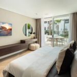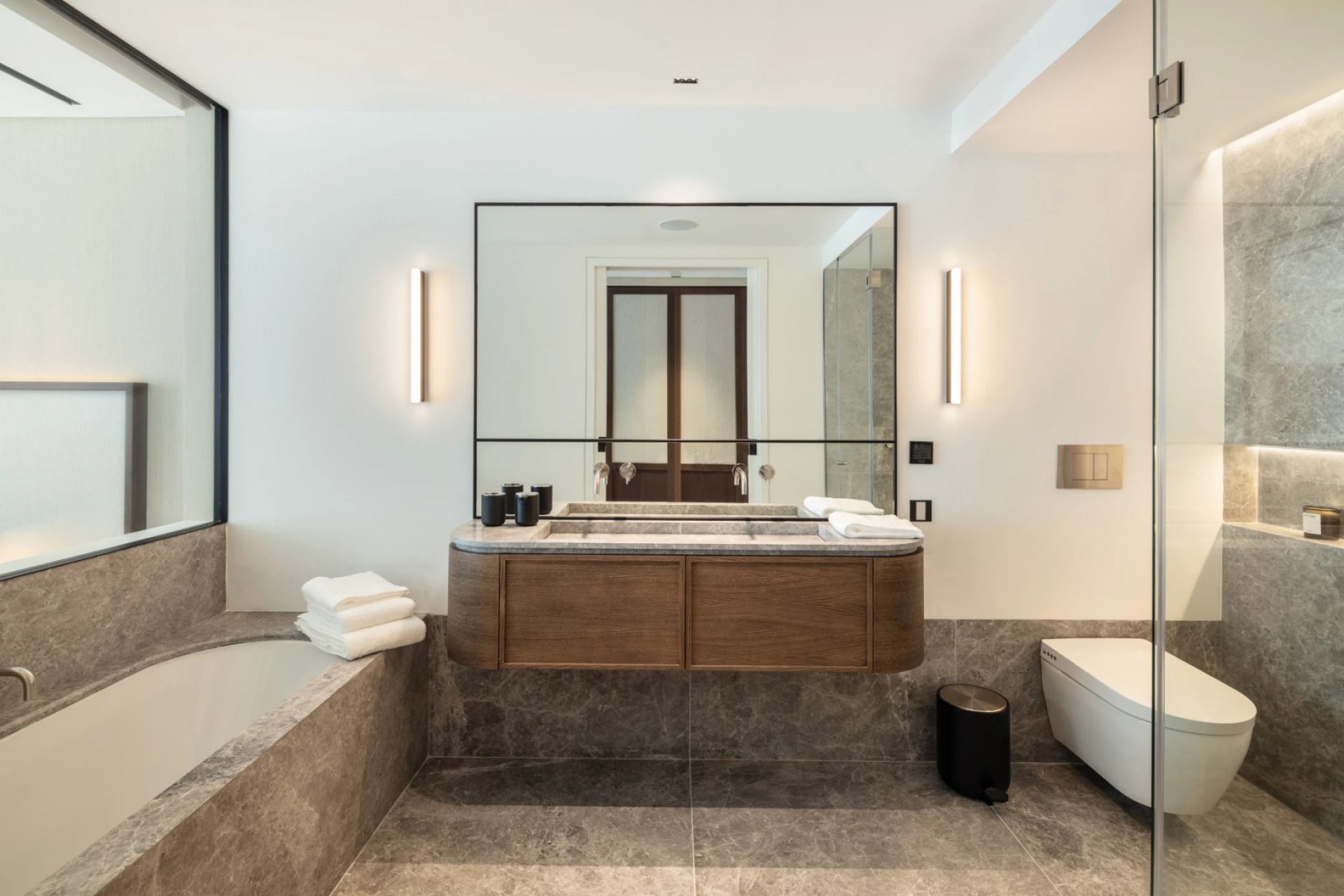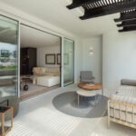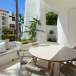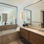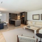 Each bedroom is meticulously designed with high-quality materials and furnishings, adhering to the overall aesthetic of the home. Every bedroom comes with its own en-suite bathroom. The master bedroom is a tranquil retreat, offering both comfort and style. A privacy glass window separates the bedroom from the luxurious bathroom, which showcases stunning grey stone on the double vanity, shower, and bathtub. Ideally located within Puente Romano, this apartment is just moments from the beach and offers easy access to the resort’s exclusive amenities and the vibrant Marbella Golden Mile.