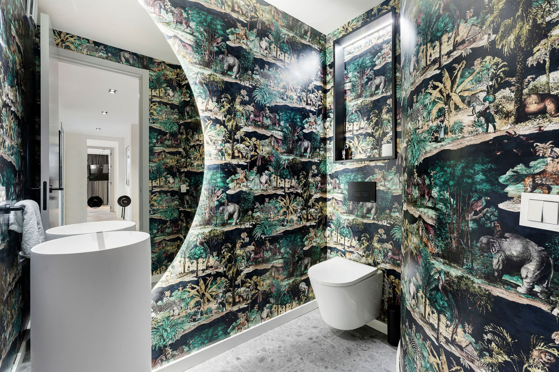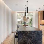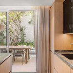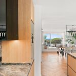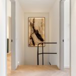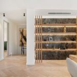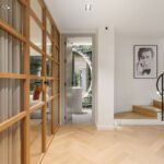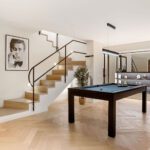The interior features premium wood and marble finishes, showcasing exceptional craftsmanship throughout. On the ground floor, the open-plan layout unites the living, dining, and kitchen areas, creating a spacious and inviting atmosphere filled with natural light. The kitchen, equipped with high-end Gaggenau appliances, is both visually appealing and highly functional, ensuring a seamless cooking experience. The area extends to a private patio, perfect for alfresco dining and relaxation. The living space is enhanced by elegant herringbone wooden floors and a neutral color palette, providing a warm and sophisticated ambiance.