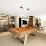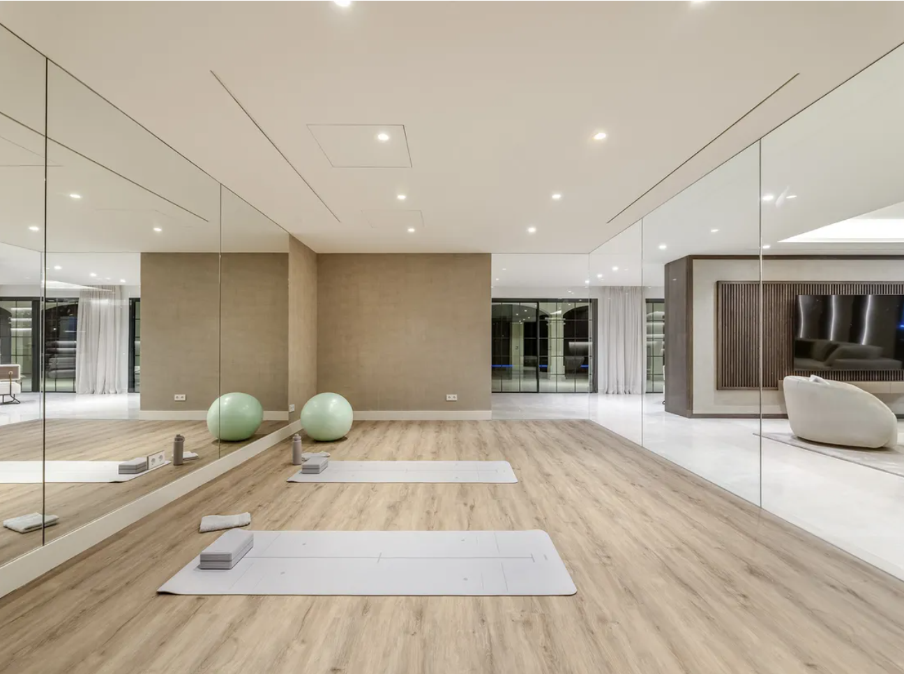 Designed for relaxation and entertainment, the villa boasts a private wellness area with spa, sauna, hammam, gym, and rooftop jacuzzi with panoramic sunset views. A stylish games and family room with pool table, custom bar, and temperature-controlled wine display completes the indoor experience.