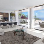 The property features 4 stylish bedrooms and 3 modern bathrooms, all thoughtfully designed for comfort and aesthetics. The living room, with expansive sliding glass doors, opens onto a spacious terrace that overlooks the stunning surrounding landscape. The outdoor space is equally remarkable, boasting a private saltwater infinity pool, south-facing terraces, and beautifully landscaped gardens. Additionally, the villa offers 3 dedicated parking spaces for residents and guests.
