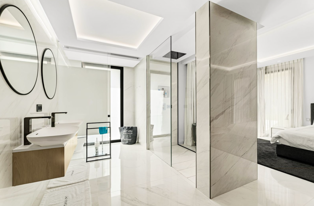 Hinzu kommt ein privater Kellerbereich, der in ein voll ausgestattetes Fitnessstudio umgewandelt wurde, das mit den gleichen High-End-Materialien wie der Hauptwohnsitz ausgestattet ist. Dieser Raum profitiert von natürlichem Licht, Lüftung und einem vollen Bad, wodurch eine komfortable und funktionale Erweiterung des Hauses. Der Fitnessraum wird direkt von einem privaten Aufzug zugegriffen, und von dort kann der Besitzer in den Garagenbereich gelangen, ohne durch irgendwelche Gemeinschaftszonen, dank einer sicheren Fingerabdruck-kontrollierten Türsystem – bietet höchste Privatsphäre und Komfort.