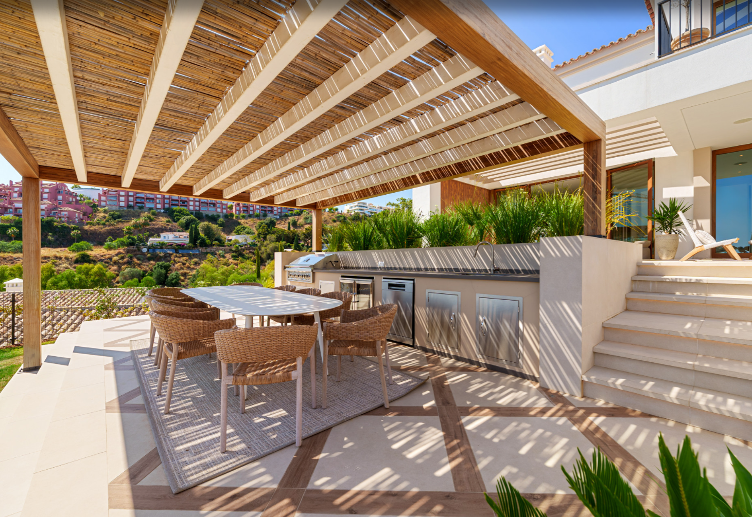 Step outside to discover a serene Mediterranean oasis: a private saltwater pool surrounded by sun-drenched terraces, a chic chill-out lounge, and a complete outdoor kitchen with BBQ—perfect for al fresco dining and entertaining.