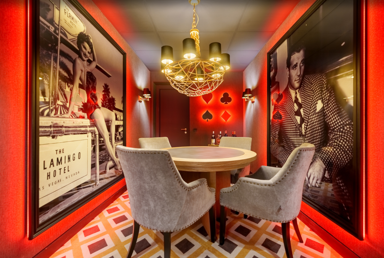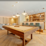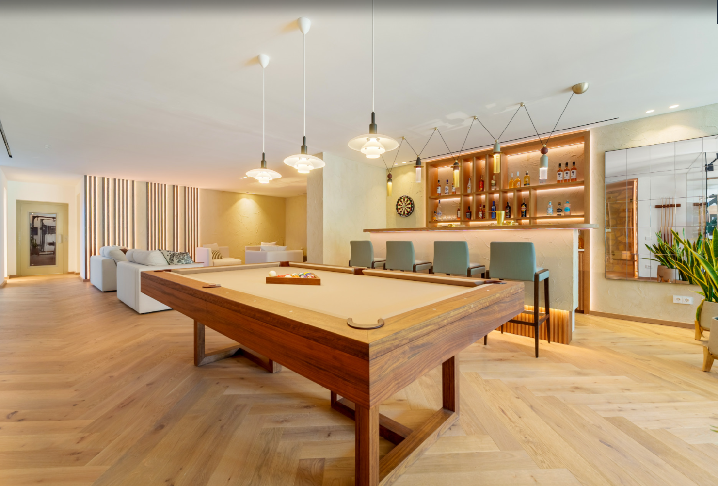 An entertainment room with billiards and a cozy TV lounge