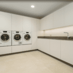 A large laundry room with four machines and ample storage