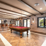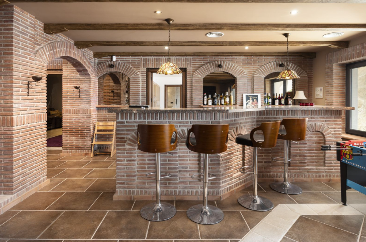 The lower level, accessible by stairs or lift, offers a second living and entertainment area complete with a rustic bar, wine racks, and a billiard table. This floor also includes two generous en-suite bedrooms with garden and pool access (one with a Turkish bath), a guest WC, a large laundry room with kitchenette and storage, and a cinema room with surround sound and theatre seating.