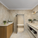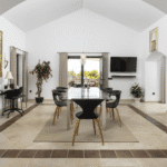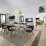 Inside, the ground floor welcomes you with a grand entrance hall and guest WC, leading to a spacious open-plan living and dining area. The sleek modern kitchen is fitted with top-of-the-line appliances, including double ovens, fridges, freezers, induction hobs, dishwasher, microwave, and a filtered water tap, with direct access to the garden. The living area opens onto a large glazed terrace with glass curtains, ideal for year-round enjoyment of both sunrise and sunset. Ambient LED lighting enhances the atmosphere, while the lift provides easy access to the rooftop jacuzzi.