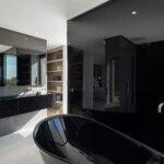 The interior features five spacious bedrooms and eight bathrooms, including six en-suite and two guest toilets. Custom furnishings by Omeo Design create a unified and elegant aesthetic throughout. The open-plan living areas are flooded with natural light and offer seamless transitions to outdoor spaces, with large windows framing uninterrupted views of the Mediterranean Sea.