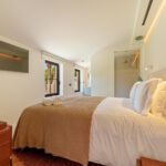 Inside, the home showcases warm, natural materials with a minimalist flair. The fully equipped kitchen features a sleek central island, while the adjoining dining and living areas offer cozy yet refined spaces, complete with a fireplace and custom cabinetry. The principal suite opens directly to the pool terrace and boasts a spa-like bathroom with freestanding tub and walk-in shower.