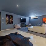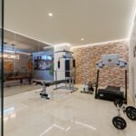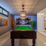 Entertainment is at the heart of this residence. The lower-level leisure room features a stylish bar, billiard table, and plush lounge area accented with contemporary artwork, ideal for hosting friends or relaxing in comfort. Nearby, a private glass-encased gym with exposed brick detailing provides a chic setting for workouts without leaving home.