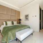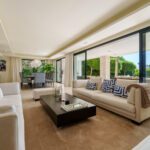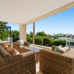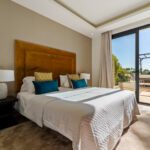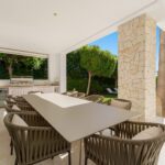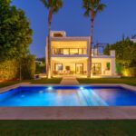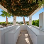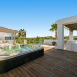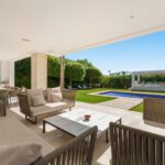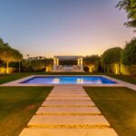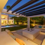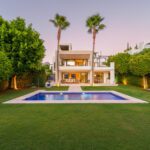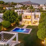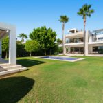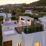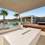 This striking contemporary villa, set within a secure private community in Nueva Andalucía, is designed for effortless relaxation and elegant entertaining. The residence is embraced by a beautifully landscaped garden featuring sculpted greenery, mature trees, and a welcoming pergola that forms a shaded outdoor lounge. A pristine private pool framed by smooth stone tiles serves as the property’s refreshing focal point, while an expansive solarium with a jacuzzi on the upper terrace invites long afternoons of sunshine and leisure.
