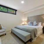 The spacious master suite offers a tranquil retreat, showcasing a luxurious bed with an upholstered headboard, a well-appointed walk-in closet, and direct access to a private terrace furnished for peaceful mornings or serene sunset moments. A private garage and generous driveway enhance convenience and security.