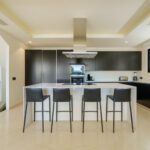 Inside, the home showcases modern sophistication with polished marble floors, sleek recessed lighting, and spacious open-plan living areas. The main living and dining zone flows seamlessly into a state-of-the-art kitchen, complete with minimalist dark cabinetry, a generous central island, and premium integrated appliances. Floor-to-ceiling sliding doors open onto a covered dining terrace equipped with a built-in grill and ample seating—perfect for al fresco meals and evening gatherings.