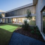 The landscaped garden blends beautifully with the surrounding environment, planted with native species such as olive trees, cypress, cork oak, lavender, rosemary, and mastic—chosen for their beauty, resilience, and minimal irrigation needs.