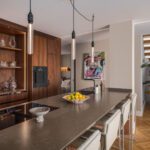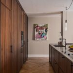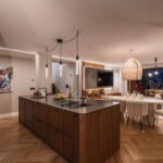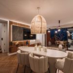 At the heart of the home is a custom-designed Nordic kitchen in warm walnut wood, complete with high-end Gaggenau and Smeg appliances. The kitchen flows effortlessly into the dining and living areas, making it ideal for both everyday living and entertaining. Every element of the interior carpentry has been tailor-made, contributing to a cohesive and luxurious aesthetic.