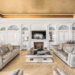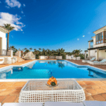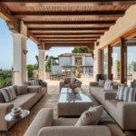 The main residence spans three levels, with a dramatic double-height entrance hall that introduces the home’s sophisticated interiors. The ground floor features a spacious open-plan living area, combining a grand lounge with a fireplace, an elegant dining room, and a cozy sitting area with a bar—perfect for entertaining. The fully equipped kitchen, complete with a utility room, opens onto terraces ideal for al fresco dining. This level also houses a luxurious en-suite guest bedroom with a private dressing area and terrace access.